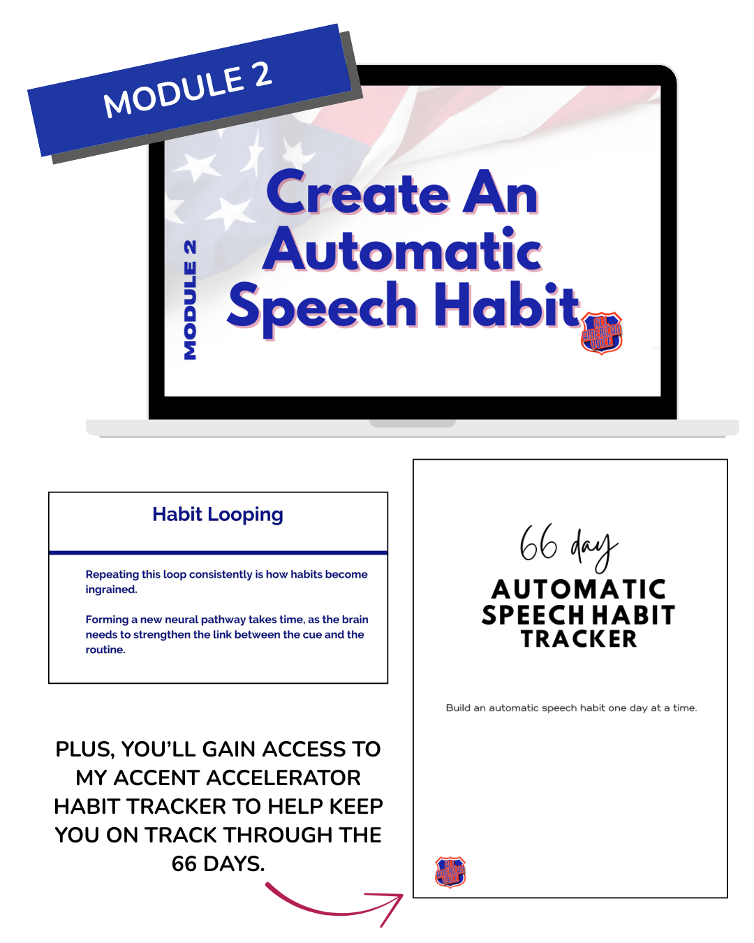 • Access 66 days of short, bite sized accent practice covering the 5 key points of accent practice to guide you toward unconscious competence, making the American accent second nature.